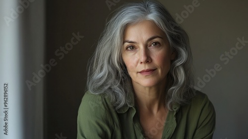A woman with gray hair and a green shirt is looking at the camera. Look healthy and happy