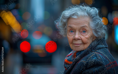 A woman with gray hair and a scarf is standing in front of a car. The scene is blurry and has a sense of nostalgia