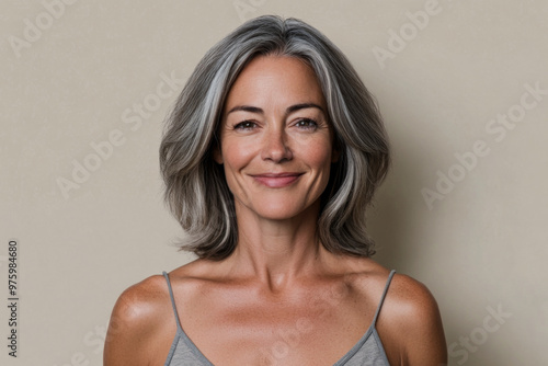 A woman with gray hair and a warm smile poses against a neutral background, showcasing her confidence and grace