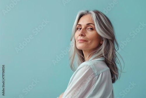 A woman with gray hair is standing in front of a blue wall