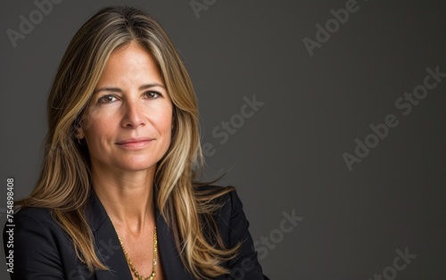 A woman with long brown hair and a black jacket is smiling. She is wearing a gold necklace