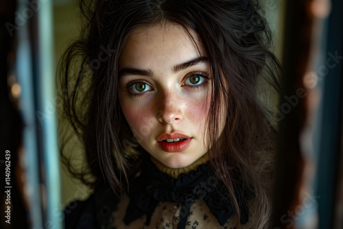 A woman with long brown hair and green eyes looking at herself in the mirror