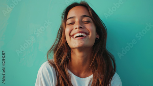 A woman with long brown hair is smiling and laughing