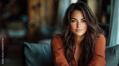 A woman with long brunette hair sits on a couch, gazing calmly into the camera with a subtle smile, conveying tranquility and comfort in a home setting.