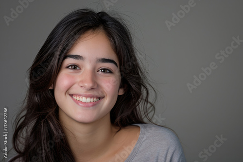 A woman with long dark hair is smiling for the camera