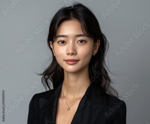 A woman with long dark hair wearing a black blazer, gold earrings, and a necklace poses against a neutral gray background creating a professional studio portrait