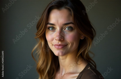 A woman with long, flowing hair is smiling brightly and looking directly at the camera, showcasing her beauty and confidence with a pleasant facial expression that radiates joy
