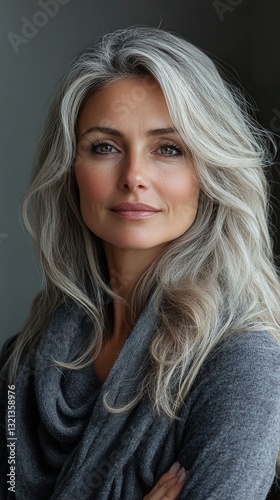 A woman with long gray hair is wearing a gray sweater and is smiling