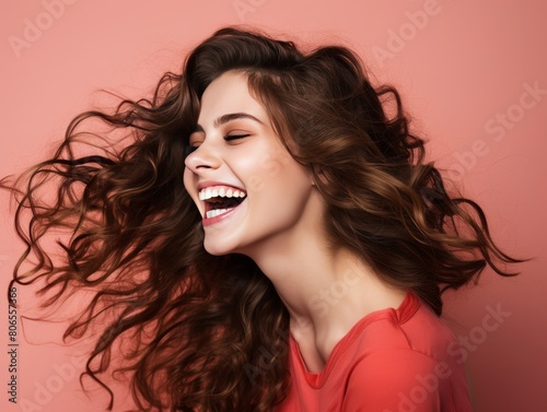 A woman with long hair is smiling and laughing while wearing color clothing