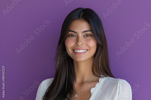 A woman with long hair is smiling at the camera. She is wearing a purple shirt. The image has a happy and positive mood