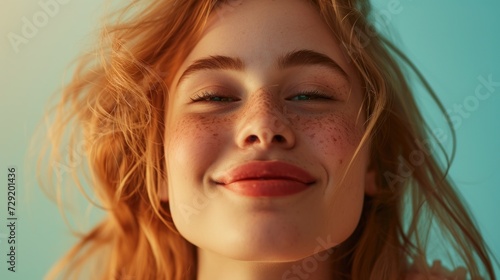 A woman with red hair and minimal makeup gazes confidently at the camera in a beauty studio.