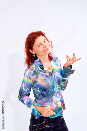 A woman with red hair is depicted against the background of a white canvas, dressed in a bright shirt with a rainbow print.
