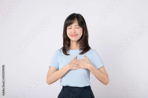 A woman with serene expression, smiling gently while placing her hands on her chest. She exudes calmness and contentment.