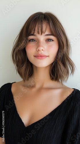 A woman with short brown hair and a black dress
