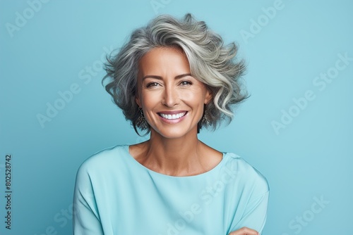 A woman with short gray hair is smiling and wearing a blue shirt