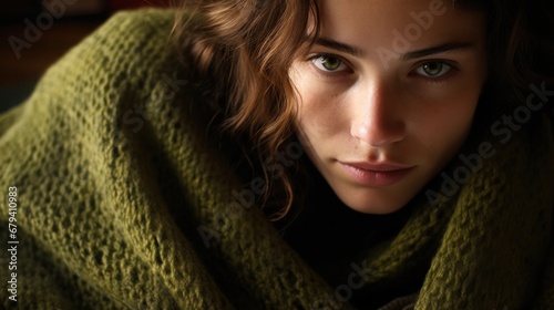 A woman wrapped in a green blanket, providing warmth and comfort.