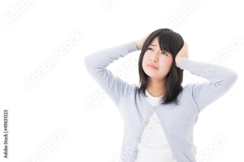 a worred young asian woman on white background