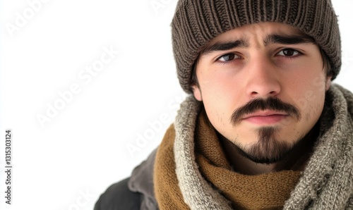 A young adult man with a goatee, wearing a beanie and scarf, expressing sadness with a slight frown, isolated on white background