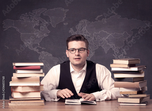 A young ambitious geography teacher in glasses sitting at classroom desk with pile of books in front of world map drawing on blackboard, back to school concept.