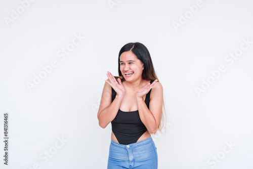 A young Asian woman in a slim black bodysuit exhibits a playful and joyful expression, isolated on a white backdrop.