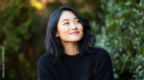 A young Asian woman wearing a casual winter sweater, smiling gently as she looks to the side, lost in thought, with a serene and contemplative expression. young Asian woman, winter