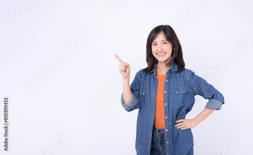 A Young asian woman wearing orange t shirt and denim jean while pointing finger to free copy space isolated on white studio background