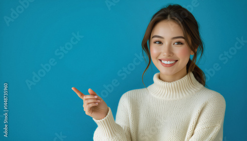 A young Asian woman with brown hair smiles and points towards the right against a teal background, wearing a cream-colored turtleneck sweater.