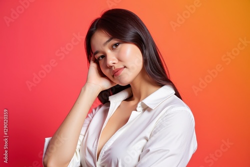 A Young Asian Woman with Long Dark Hair Posing Elegantly Against a Vibrant Gradient Background in a Stylish White Blouse, Capturing a Thoughtful Expression