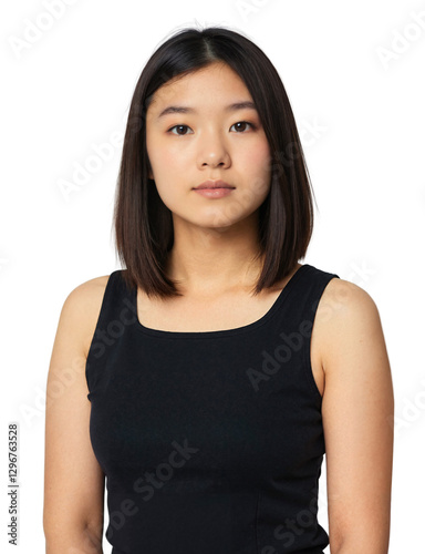 A young Asian woman with shoulder-length black hair wears a black sleeveless top, standing against a white background.