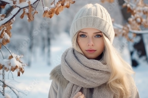 a young beautiful blonde in winter clothes walking in a snowy forest