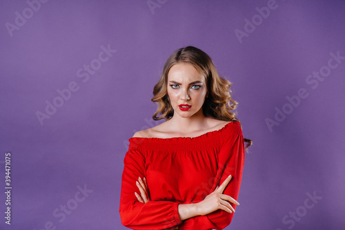 A young beautiful girl shows emotions and smiles in the Studio on a purple background. Girls for advertising