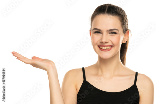 A young beautiful smiling woman with tied hair advertises an imaginary product