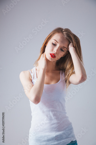 A young beautiful woman standing in underwear
