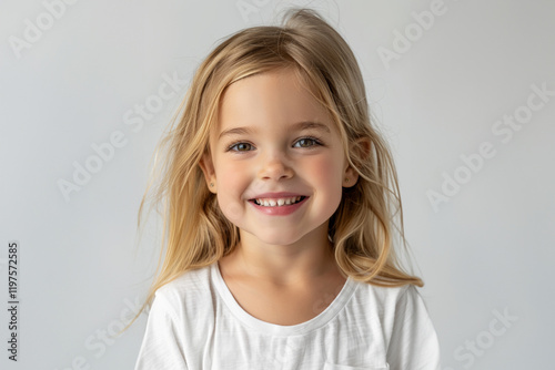A young blonde child with long hair smiles gently, wearing a white shirt, against a neutral light background. The child’s soft expression and natural look create a warm, calm atmosphere.