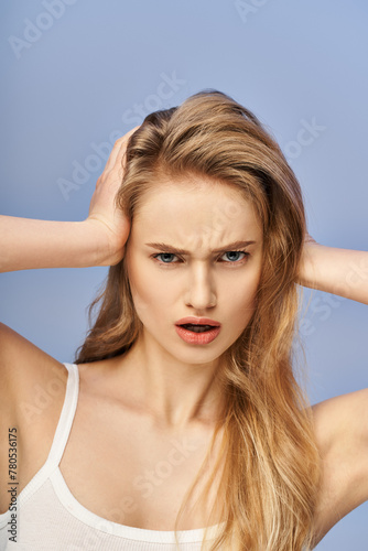 A young blonde woman holding hands near blonde hair, in a studio setting.