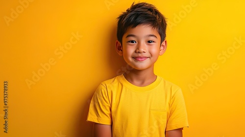 A young boy in a yellow shirt smiles at the camera against a bright yellow background.