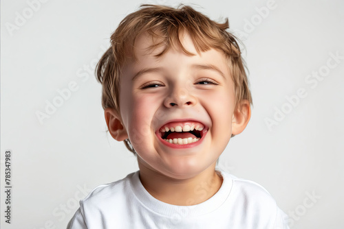 A young boy is smiling and laughing.