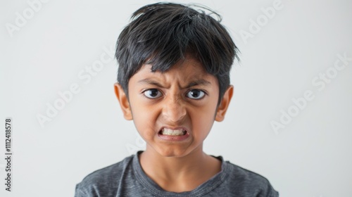 A young boy with a frustrated expression showing his teeth and furrowed eyebrows.