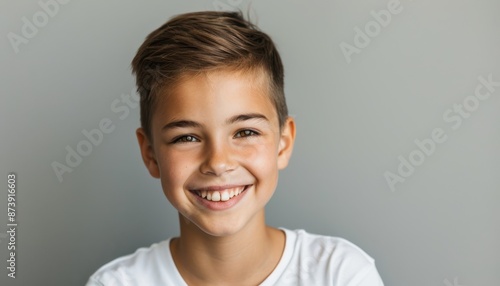 A young boy with a white shirt and short hair is smiling. He has a few teeth visible
