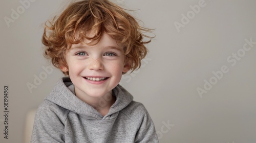 A young boy with curly red hair smiles broadly, wearing a gray hoodie