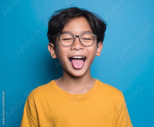 A young boy with glasses sticks his tongue out in a playful expression against a bright blue backdrop.