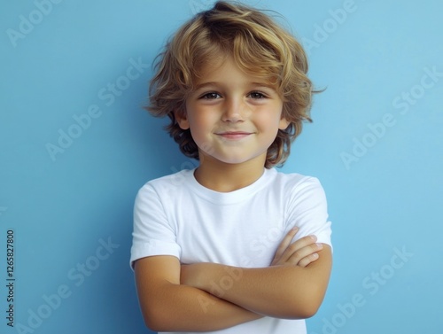 A young boy with tousled hair standing against a blue background, exuding confidence and joy.