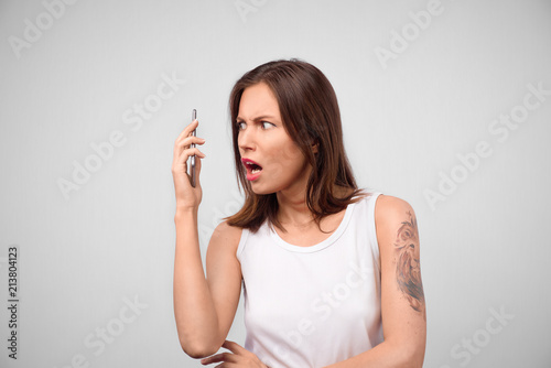 A young brunette woman looks at the screen of her smartphone with amazement and horror and opens her mouth. Restless and irritated state and emotions. She is shocked by the received message and news