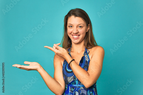 A young caucasian woman isolated excited holding a copy space on palm.