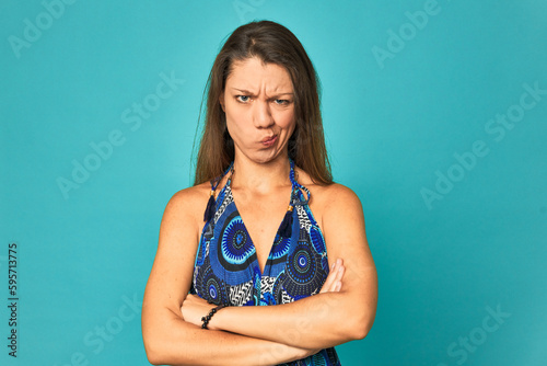 A young caucasian woman isolated frowning face in displeasure, keeps arms folded.