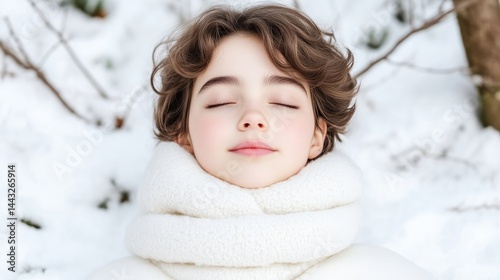 A young child with closed eyes lying in snowy forest, wrapped in white scarf, serene winter scene with bare trees, and peaceful outdoor moment.