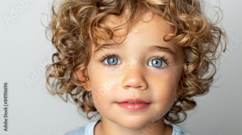 A young child with curly hair and blue eyes is smiling. The child is wearing a blue shirt and is looking directly at the camera