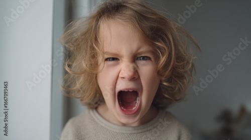 A young child with curly hair is shouting loudly, showcasing raw emotion. The setting is indoors with soft lighting, highlighting the intensity of the moment.