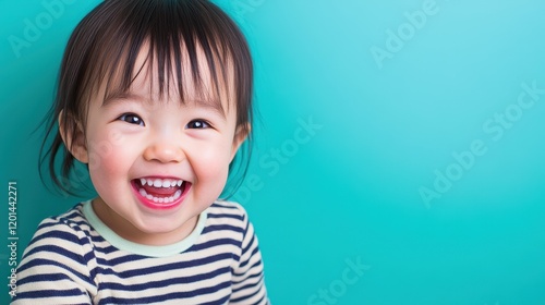 A young child with dark hair laughs widely, showcasing a joyful expression. The vibrant blue backdrop enhances their cheerful demeanor, making it an uplifting moment