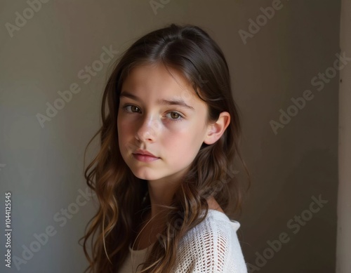 A young cute Caucasian girl residing in France is captured in a moment of reflection, her wavy hair falling gracefully around her shoulders while she exudes calm confidence. Generative AI